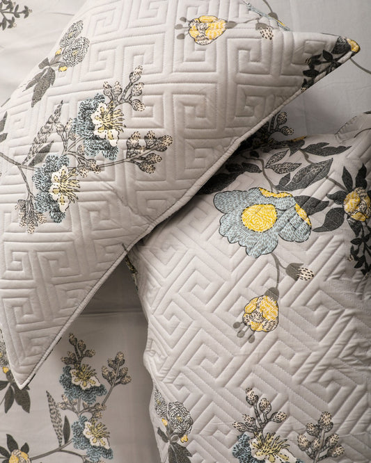 ANTHURIUM- King Size Bedsheet with Quilted Pillow Covers (Gray Floral)