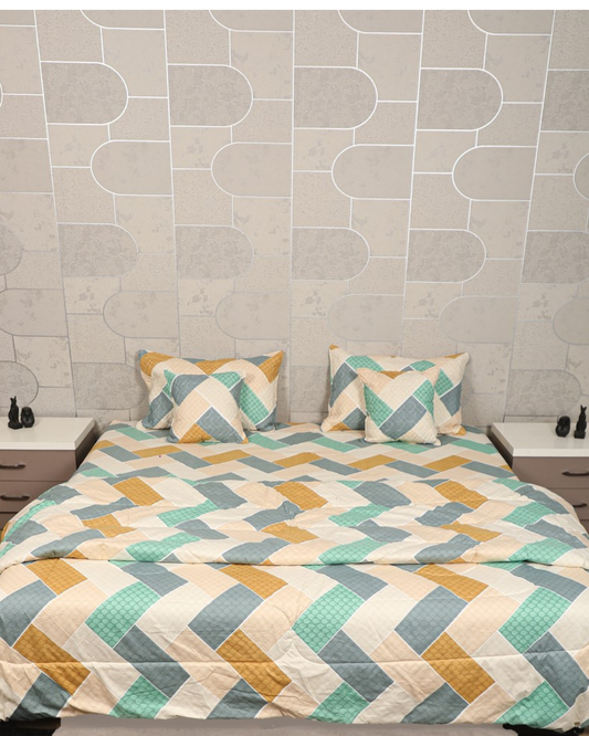 MARIGOLD – 6 Pc Bedset | Bedsheet, Comforter, Pillow Cover & Cushions (Geometric Print)