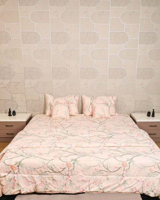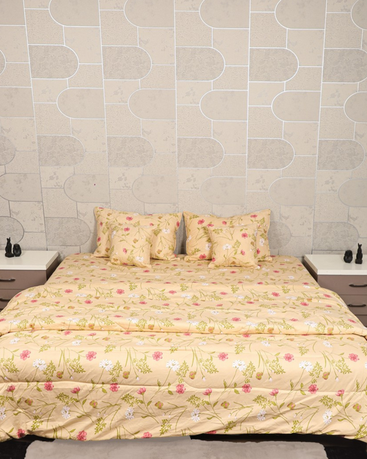 MARIGOLD - 6 Pc Bedset | Bedsheet, Comforter, Pillow Cover & Cushions (Cream Floral)