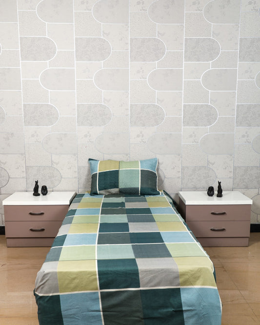 Anthurium - SINGLE BEDSHEET WITH QUILTED PILLOW COVER (Check Green)